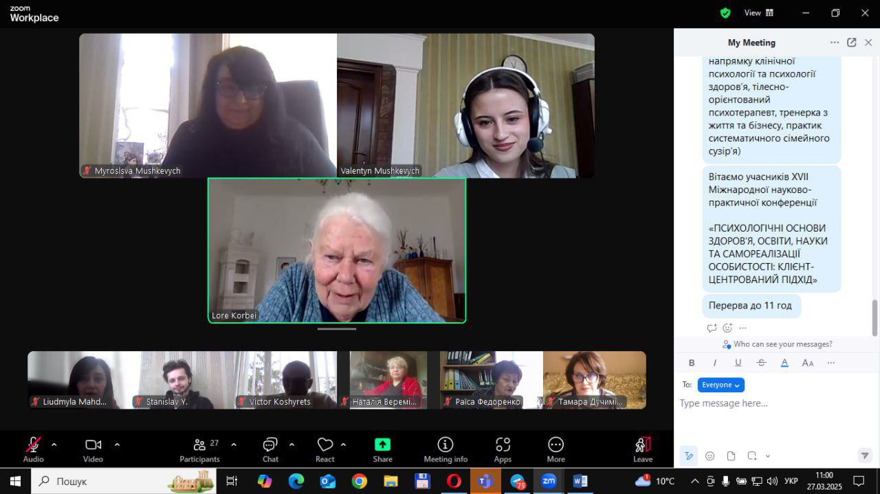 – «Клієнт-центрована психотерапія і сім’я» (Мирослава Мушкевич (Україна) – доктор психологічних наук, професор кафедри практичної психології та психодіагностики, практичний психолог, психоконсультант у напрямі позитивної психотерапії, психотерапевт у напрямі клієнт-центрованої психотерапії, директор Психологічного консультативного центру, професор Інституту клієнт-центрованої і експірієнтальної психотерапії).